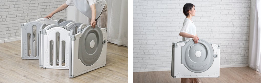 (写真左:広げて固定するだけで簡単設置が可能な折り畳み式/写真右:コンパクトに持ち運び可能なベビーサークル)