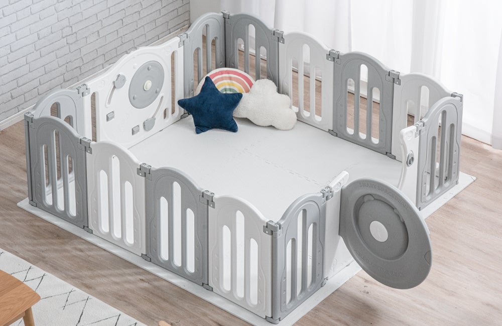 普段は仕舞えて、必要な時だけ簡単に設置することで、育児期のお部屋の有効活用をご提案。おもちゃパネル付きなのでお子様の一人遊びにも最適な“折り畳みベビーサークル”を発売開始。