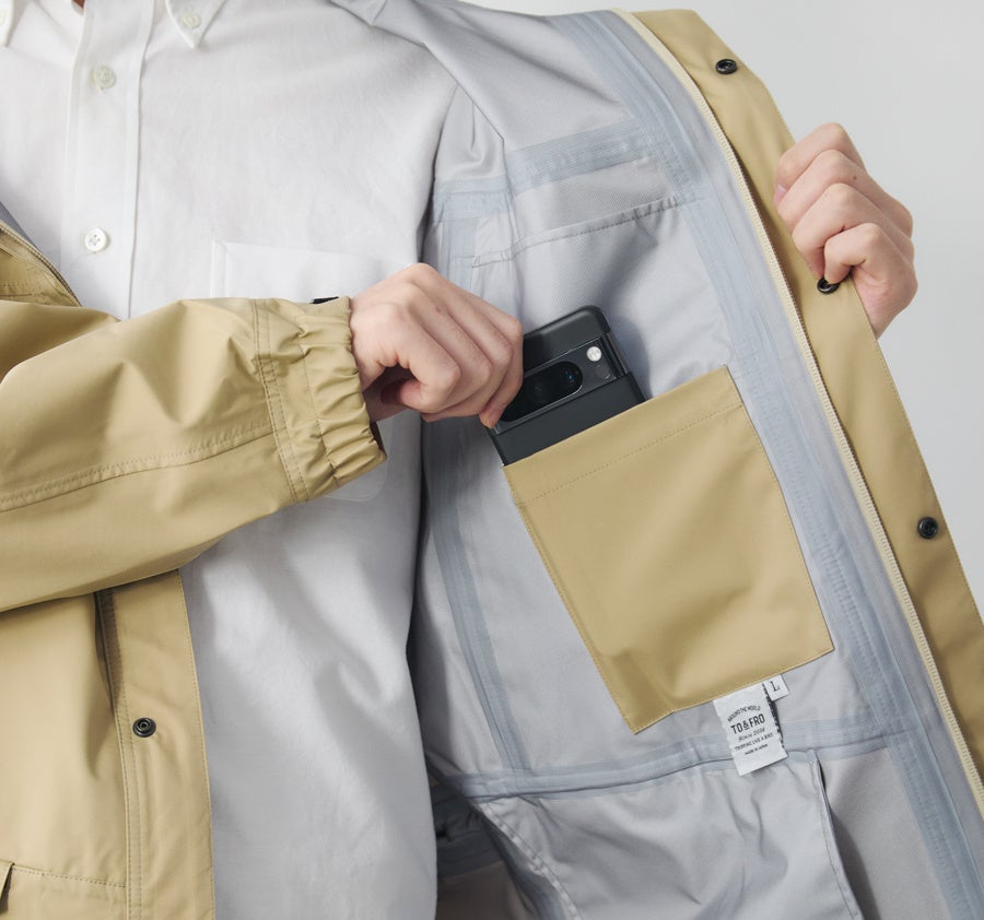 また、一般的なマウンテンパーカーは内ポケットが少なめですが、本パーカーでは街着での着用も踏まえて充実させました。