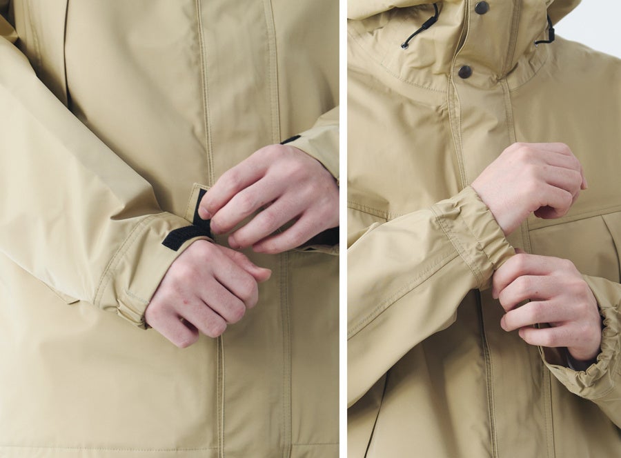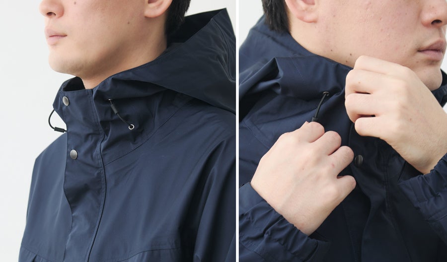 フード後ろにもベルクロのアジェスターを設け、雨風の状況によって視界の広さを調節可能です。