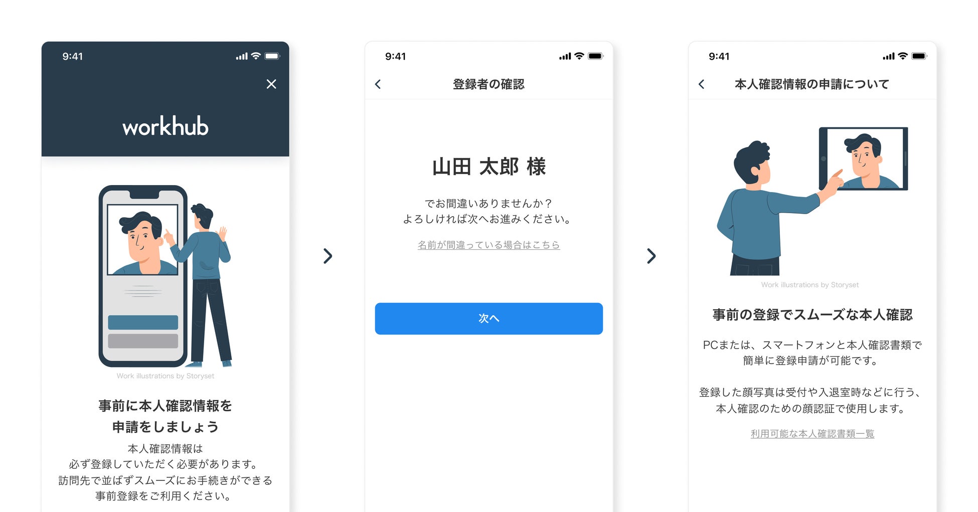②〜④:workhub専用ページから必要情報(入館者の顔情報と運転免許証等の本人確認書類)を登録