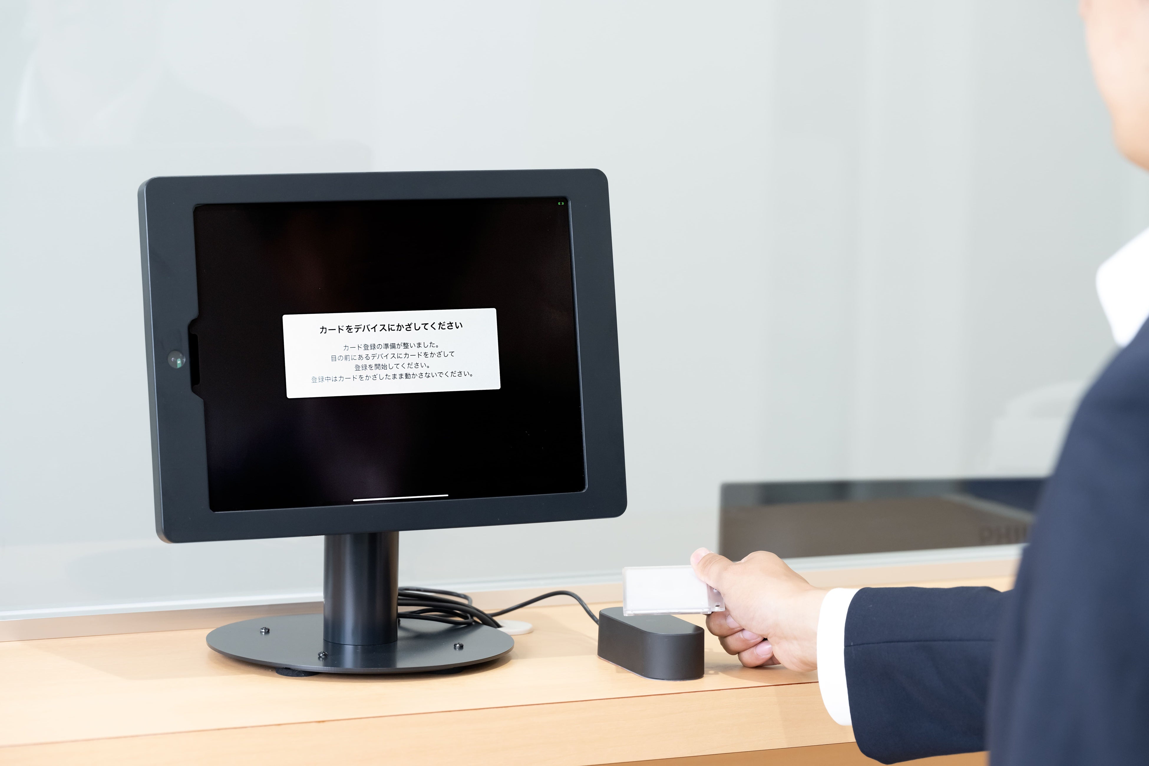 ⑩〜⑫:手続き完了後、受付に設置されているICカードをカードリーダー(bitreader+)にかざして、