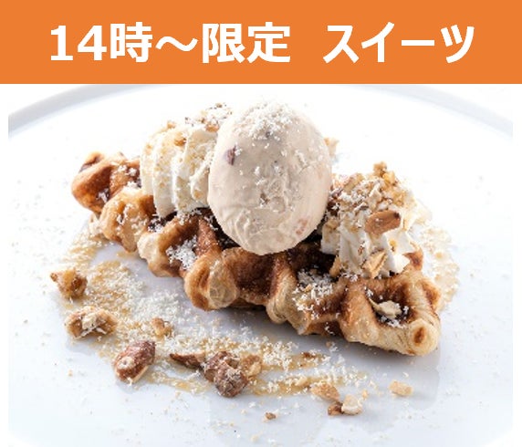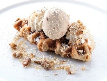 メープルナッツクッキーアイスをクロッフルの上に乗せてメープルシロップ、ミックスナッツなどをトッピングした一皿です。