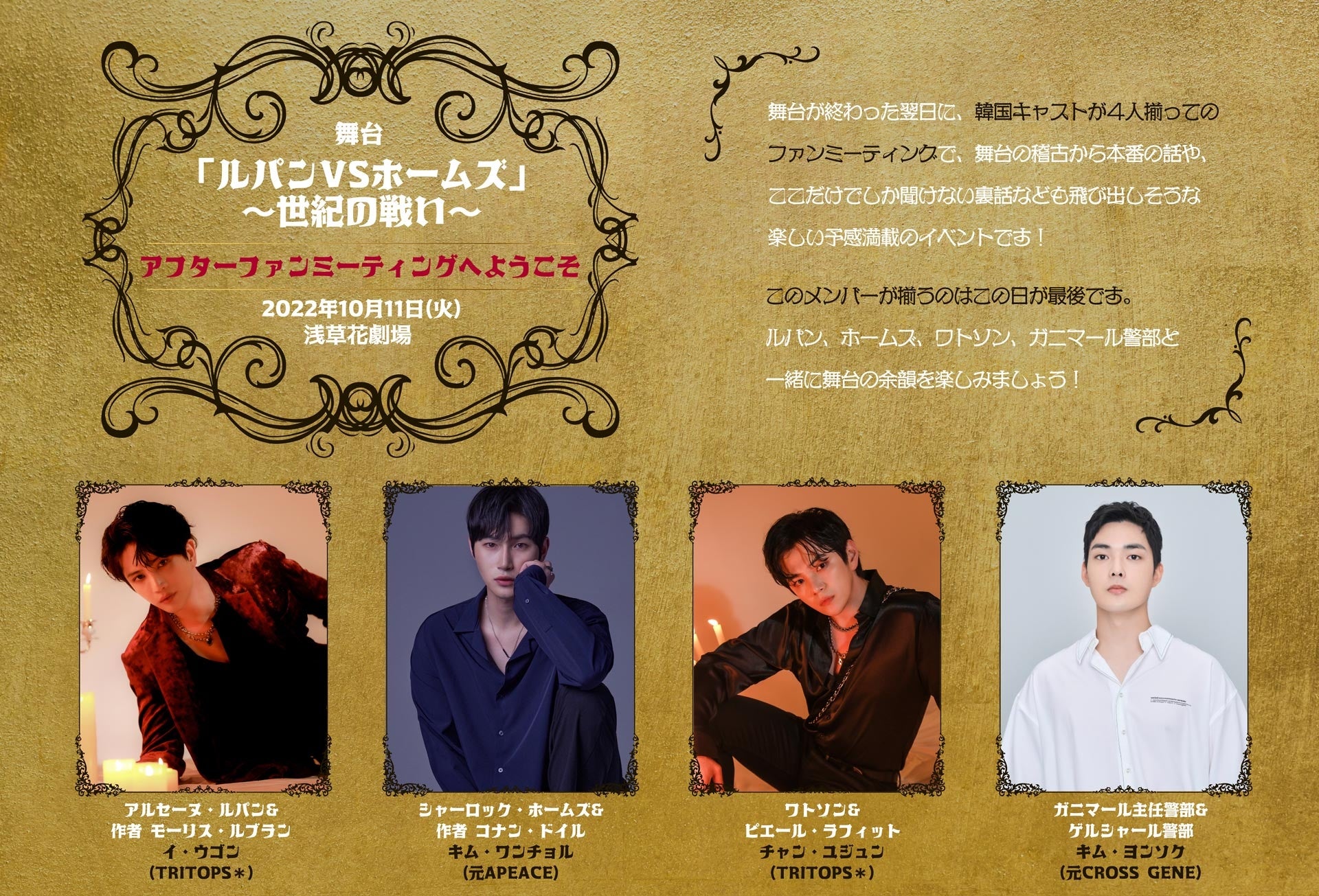 10/7(金)~10/10(月・祝)まで浅草花劇場で上演される舞台『ルパンvsホームズー世紀の戦い― ~百年書店へようこそ~』の千穐楽の翌日、10/11(火)に、イ・ウゴン(TRITOPS*)、キム・ワンチョル(元APEACE)、チャン・ユジュン(TRITOPS*)、キム・ヨンソク(元CROSS GENE)出演で、アフターファンミーティングが決定!