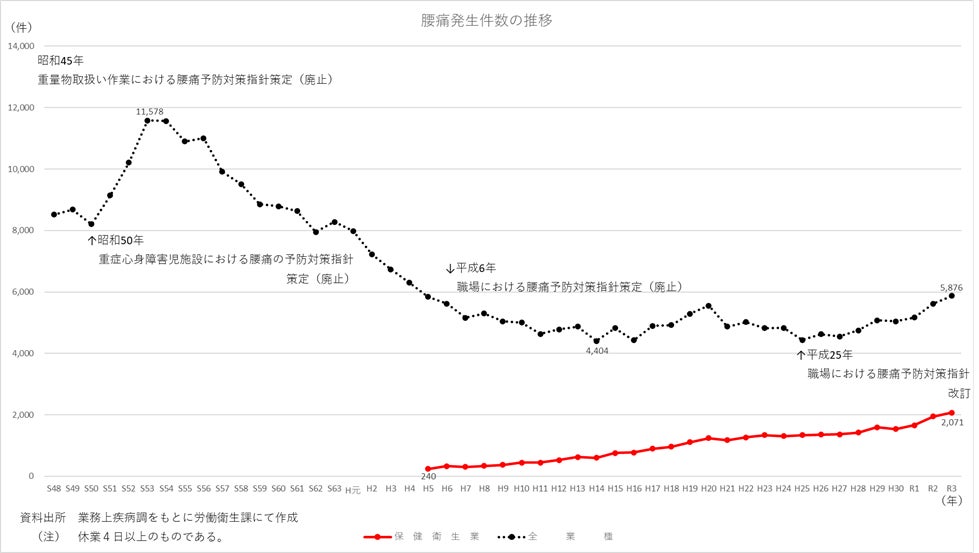 日本の介護業界では、職員の高齢化が進み、腰痛問題が深刻な課題となっています。厚生労働省の「保健衛生業における腰痛の予防」によると、介護・看護業界を含む保健衛生業では平成5年以降、腰痛の発生件数が増加を続けていることが報告されています。(※下図参照)また、腰痛は介護職員の休職・離職理由の一因にもなっており、特に入浴介助、排泄介助、移乗介助といった身体介護業務では、立ちっぱなしの業務や前傾姿勢を維持する作業、利用者を支える動作が求められるため、腰への負担が大きくなります。これにより、慢性的な痛みを引き起こし、休職・離職により人手不足が深刻化している状況です。こうした背景から、腰痛対策の強化は、介護業界における持続可能な労働環境の構築と、質の高い介護サービスの提供を維持するために不可欠な課題となっています。