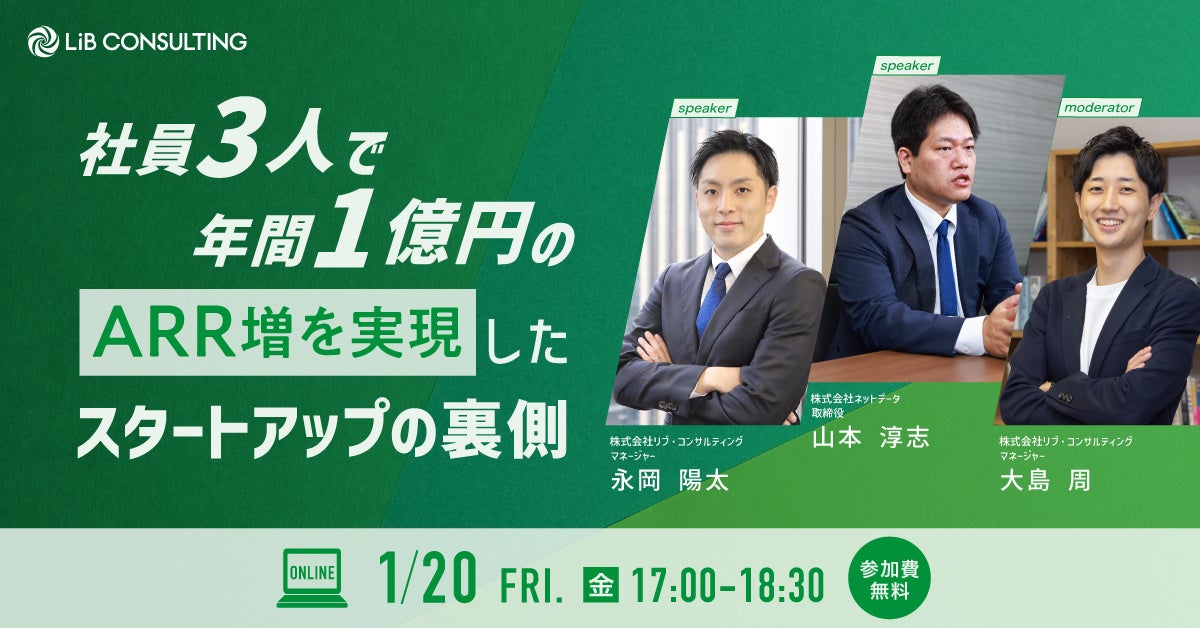 株式会社リブ・コンサルティング(本社:東京都千代田区、代表取締役:関 厳)は、年間1億円のARR増を実現させた株式会社ネットデータの取締役山本様をゲストにお迎えし、驚異的な成長の知られざる実態について、弊社マネージャー大島およびアソシエイトマネージャー永岡とのパネルディスカッション形式で語っていただくセミナーを2023年1月20日(金)に開催いたします。