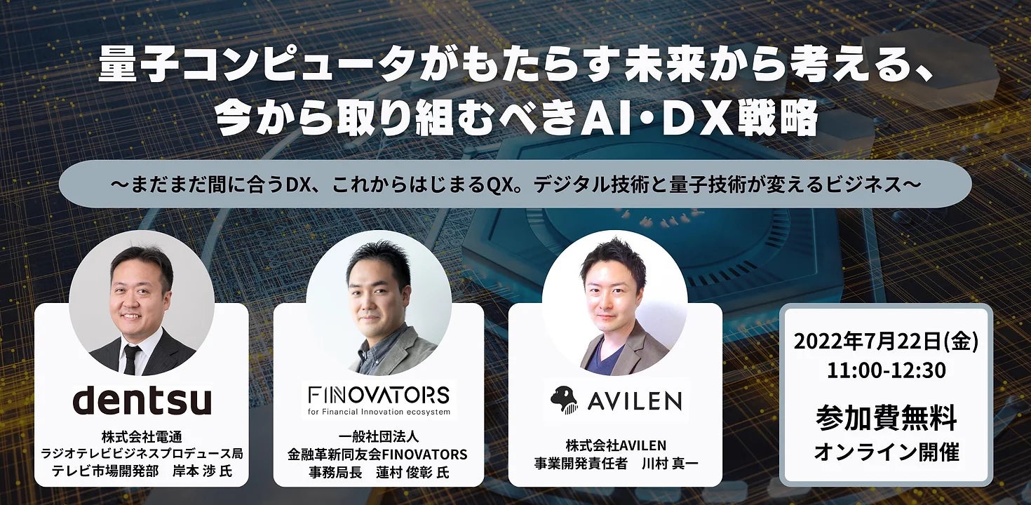 株式会社AVILEN(東京都中央区、代表取締役:高橋 光太郎、以下「AVILEN」)は、ジャフコ グループ株式会社(本社:東京都港区、取締役社長;三好 啓介)と共同で、2022年7月22日(金)11時から、オンラインセミナー『量子コンピュータがもたらす未来から考える。今から取り組むべきAI・DX戦略 』を開催します。