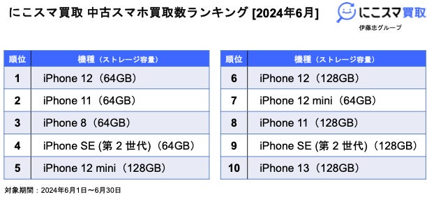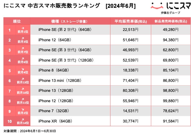 2024年6月の販売数ランキングでは、iPhone SE(第2世代)が7ヶ月連続で1位にランクインしました。