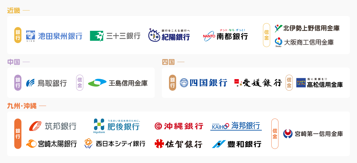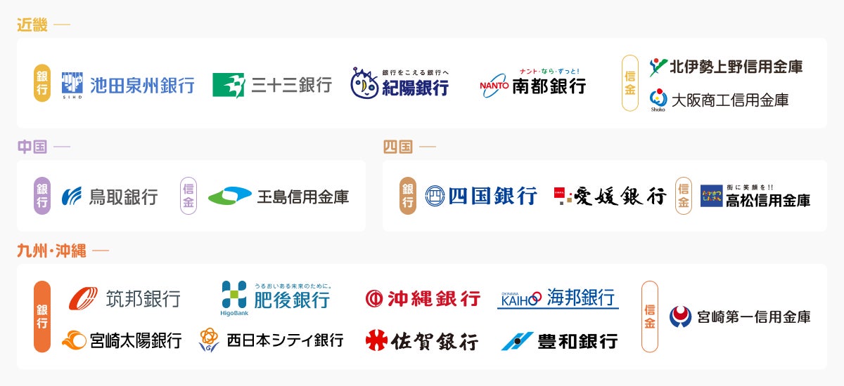 鳥取銀行、筑邦銀行、八十二銀行、肥後銀行、四国銀行、池田泉州銀行、秋田銀行、三十三銀行、愛媛銀行、北日本銀行、沖縄銀行