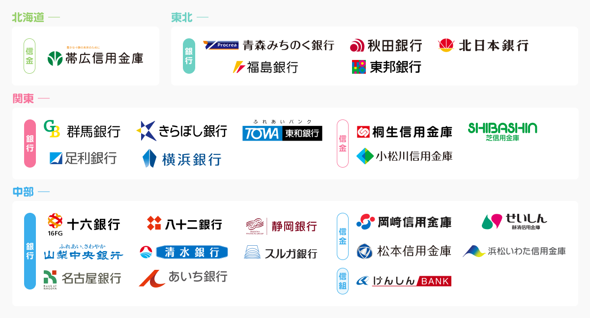 芝信用金庫、帯広信用金庫、岡崎信用金庫、北伊勢上野信用金庫、静清信用金庫、大阪商工信用金庫、松本信用金庫、玉島信用金庫