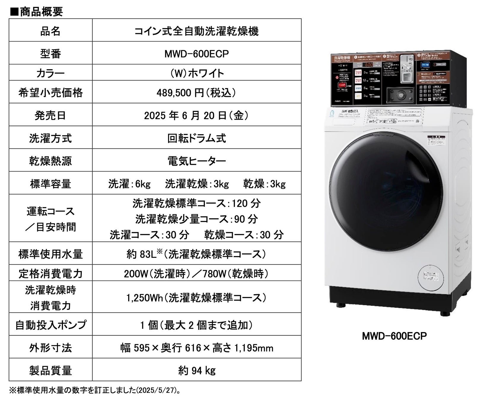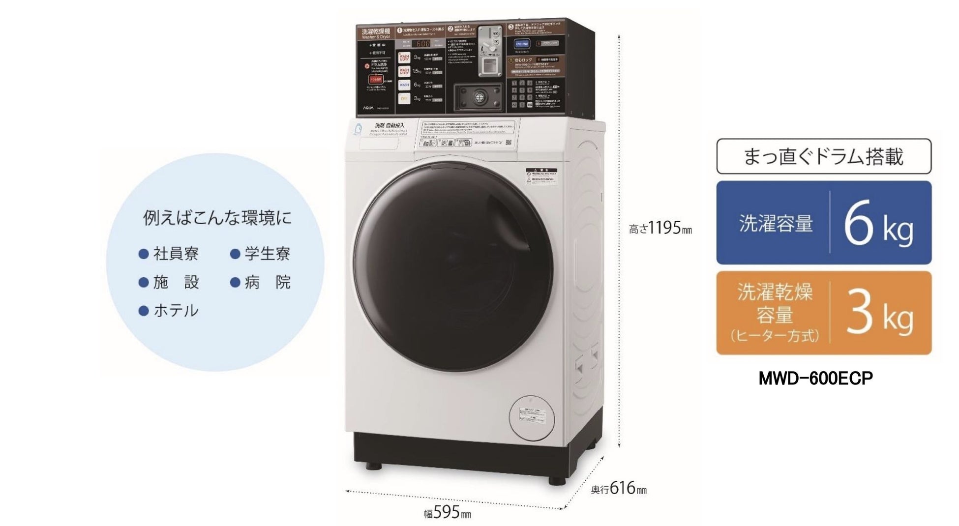 アクア株式会社(本社:東京都中央区、代表取締役社長 兼 CEO:杜 鏡国)は、業務用コイン式全自動洗濯乾燥機「MWD-600ECP(洗濯容量6kg/洗濯乾燥容量3kg/乾燥容量3kg)」を、2025年6月20日(金)より発売いたします。