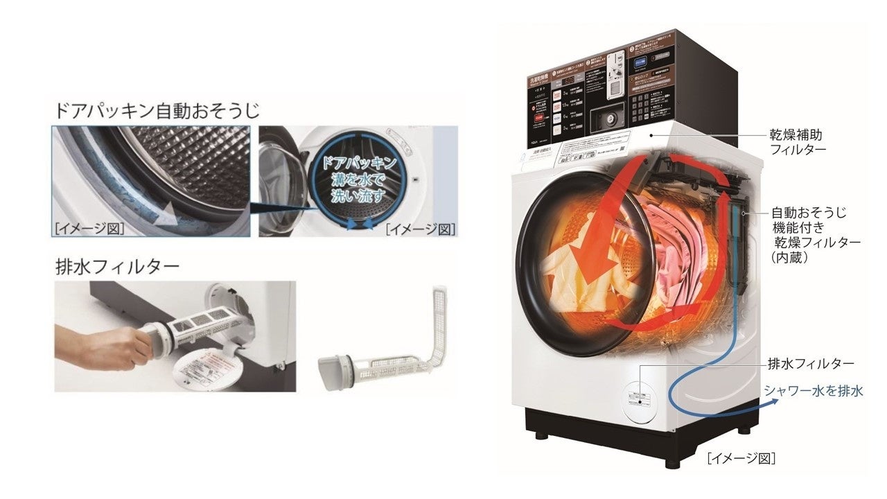 本製品は、省スペースに設置できるコンパクト設計と、家庭用でも好評の“まっ直ぐドラム”を採用し、ホテル・病院・寮などの施設に最適です。さらに、乾燥フィルターやドアパッキンの自動おそうじ機能(※1)(※2)、高性能な排水フィルターにより、施設側のメンテナンス負担を軽減します。