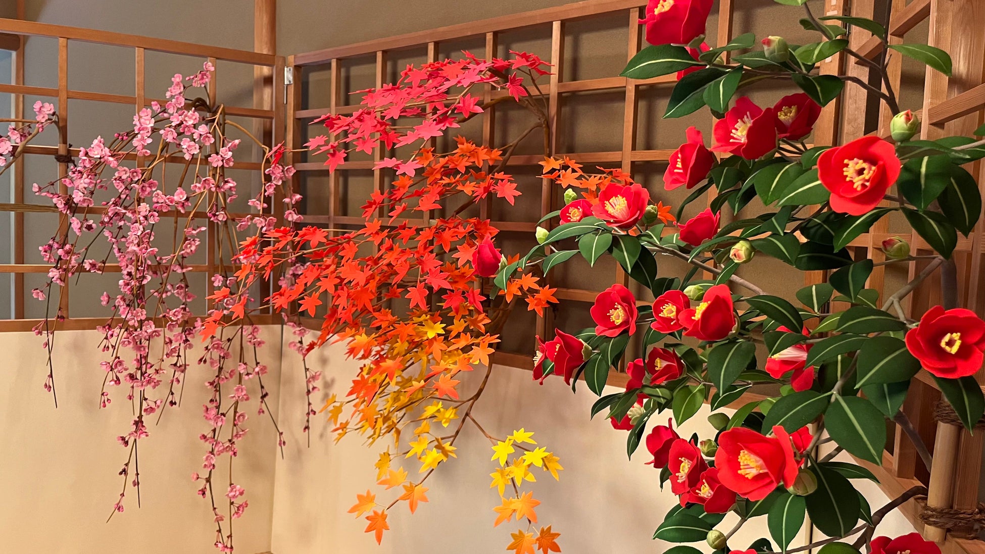 鶴屋吉信の京菓子職人が京都の四季をテーマに、「春・夏・秋・冬」をあらわす植物を和菓子の素材でつくりあげました、迫力あふれる工芸菓子となっています。この規模の展示を眼の前でご覧いただける貴重な機会となっておりますので、ぜひ鶴屋吉信本店2階・お休み処へお越しくださいませ。
