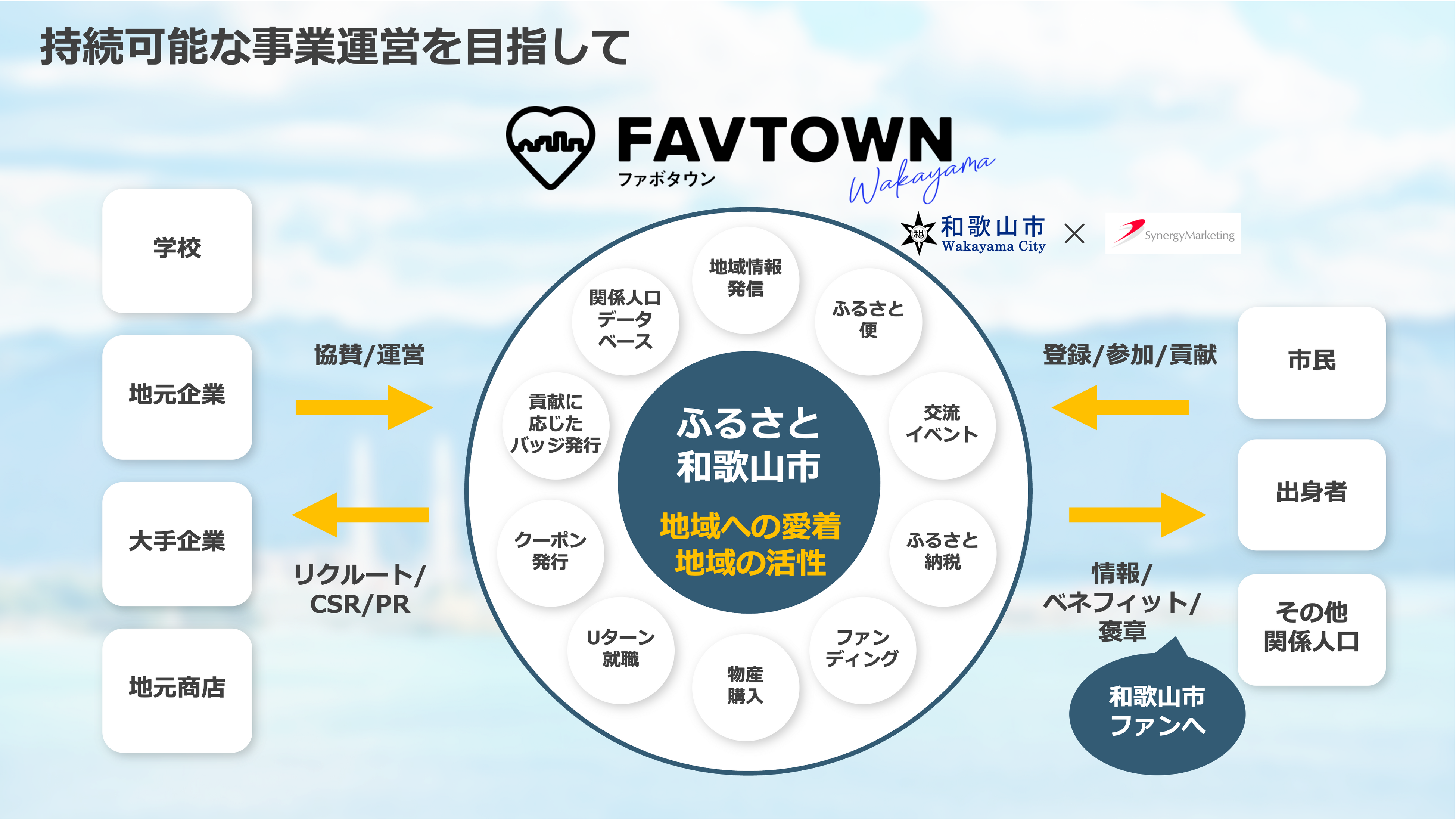 「FAVTOWN」は、当社のCRMやデジタルマーケティングの専門知識を活かしたデジタルプラットフォームです。「FAVTOWN」とは、‘Favorite Town(お気に入りのまち)’を略して名付けました。「FAVTOWN」の企画に際しては、全国的に進む少子高齢化の加速に加え、都市圏への人口流出を課題とする地方都市などに向け、「地元が好き」という想いを持つ転出者などとつながり、地域の情報提供や住民との交流を促し、ふるさとへの愛着を深め、育むことを目的としました。まずは実証事業として、上記課題を持っていた和歌山市と連携協定を結び実施をいたしました。
