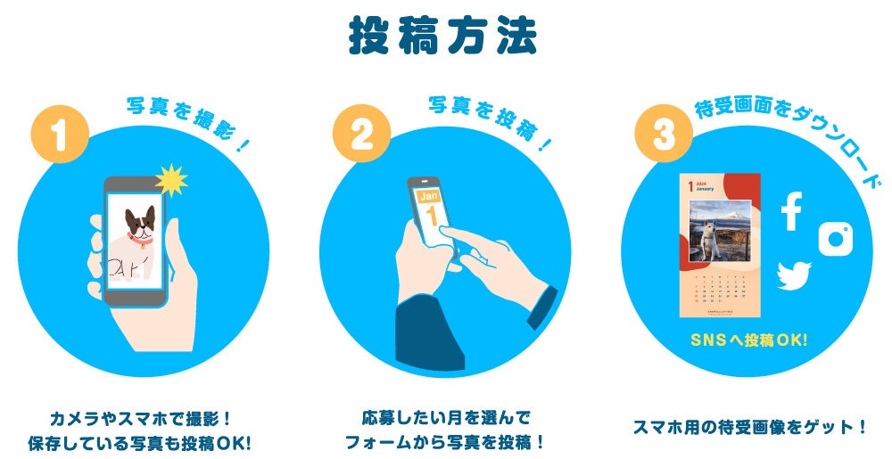 応募方法 | 本キャンペーンサイトより、写真をアップロードしてご応募いただきます。 カレンダーにしたい月を選択いただき、ペットの写真を投稿いただきます。 |