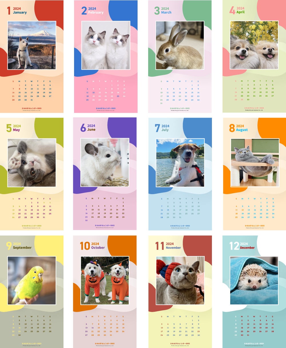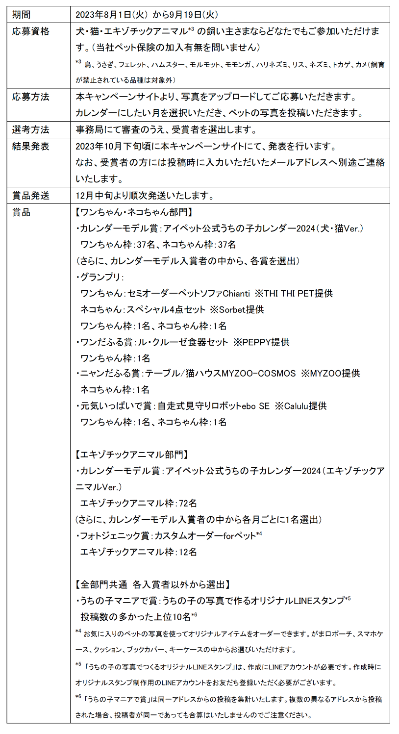 賞品 | 【ワンちゃん・ネコちゃん部門】 ・カレンダーモデル賞:アイペット公式うちの子カレンダー2024(犬・猫Ver.) ワンちゃん枠:37名、ネコちゃん枠:37名 (さらに、カレンダーモデル入賞者の中から、各賞を選出) ・グランプリ: ワンちゃん:セミオーダーペットソファChianti ※THI THI PET提供 ネコちゃん:スペシャル4点セット ※Sorbet提供 ワンちゃん枠:1名、ネコちゃん枠:1名 ・ワンだふる賞:ル・クルーゼ食器セット ※PEPPY提供 ワンちゃん枠:1名 ・ニャンだふる賞:テーブル/猫ハウスMYZOO-COSMOS ※MYZOO提供 ネコちゃん枠:1名 ・元気いっぱいで賞:自走式見守りロボットebo SE ※Calulu提供 ワンちゃん枠:1名、ネコちゃん枠:1名 【エキゾチックアニマル部門】 ・カレンダーモデル賞:アイペット公式うちの子カレンダー2024(エキゾチックアニマルVer.) エキゾチックアニマル枠:72名 (さらに、カレンダーモデル入賞者の中から各月ごとに1名選出) ・フォトジェニック賞:カスタムオーダーforペット*⁴ エキゾチックアニマル枠:12名 【全部門共通 各入賞者以外から選出】 ・うちの子マニアで賞:うちの子の写真で作るオリジナルLINEスタンプ*⁵ 投稿数の多かった上位10名*⁶ *⁴お気に入りのペットの写真を使ってオリジナルアイテムをオーダーできます。がま口ポーチ、スマホケース、クッション、ブックカバー、キーケースの中からお選びいただけます。 *⁵「うちの子の写真でつくるオリジナルLINEスタンプ」は、作成にLINEアカウントが必要です。作成時にオリジナルスタンプ制作用のLINEアカウントをお友だち登録いただく必要がございます。 *⁶「うちの子マニアで賞」は同一アドレスからの投稿を集計いたします。複数の異なるアドレスから投稿された場合、投稿者が同一であっても合算はいたしませんのでご注意ください。 |