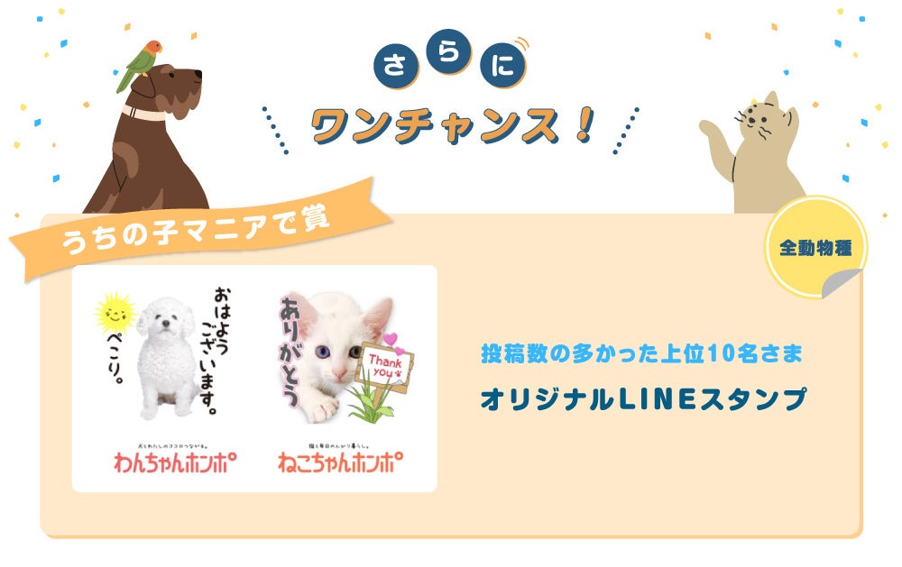 2015年からワンちゃん、ネコちゃんを対象に実施してまいりました当社の人気企画に、今年はエキゾチックアニマルも対象に加わり、さらに多くのみなさまにご参加いただけるようになりました。本コンテストは、みなさまの大切な家族であるペットの愛くるしい様子や表情を「うちの子の自慢の写真」として投稿していただくことでご参加いただけます。投稿いただいた「うちの子」の写真は、キャンペーンサイト上に掲載され、いつでもご覧いただくことができます。*²