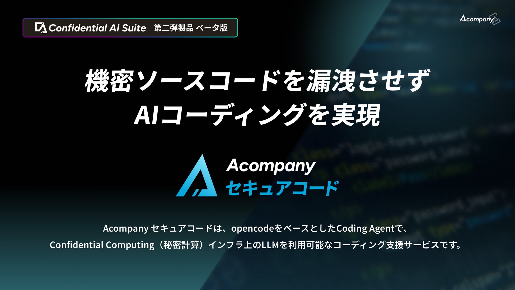 株式会社Acompany(アカンパニー、代表取締役CEO 高橋亮祐、以下Acompany)は、安全で秘密を守れるAI製品ブランド「Confidential AI Suite」の第二弾として、企業の機密ソースコードを保護しながらAIによるコーディング支援を受けられる「Acompany セキュアコード」のベータ版の提供を開始いたします。あわせて、先行導入企業の募集を開始いたします。
