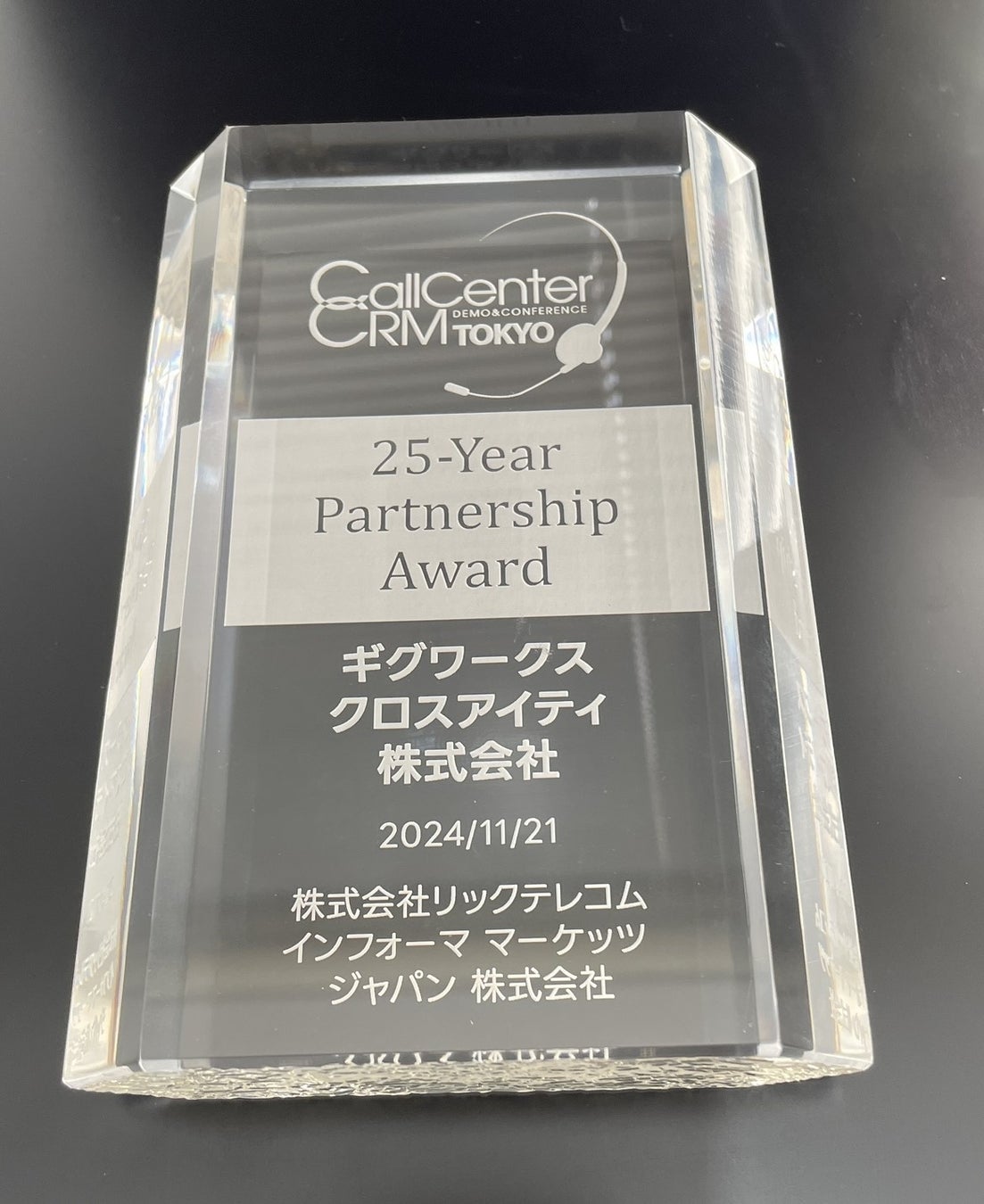 ギグワークスクロスアイティ株式会社(ギグワークス株式会社(東証スタンダード 2375)子会社 本社:東京都港区、代表取締役社長:小島正也、以下ギグワークスクロスアイティ)は、株式会社リックテレコム 月刊コールセンタージャパン、インフォーマ マーケッツ ジャパン株式会社が主催するコールセンター業界に向けた国内最大級のイベント『コールセンター/CRM デモ&コンファレンス 2024 in 東京 (第25回) 』に出展し、2000年の初開催から25年連続で出展していることから25年連続出展賞を受賞しました。