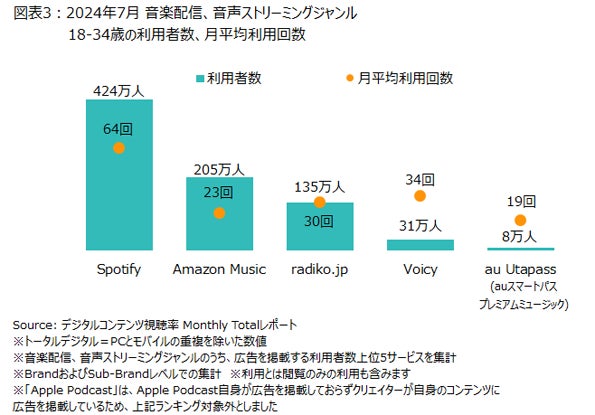 最後に、ターゲットGRP(TARP)が最も高かった18-34歳の利用状況をサービス別に見ると、利用者数は「Spotify」が424万人で最も多く、次いで「Amazon Music」が205万人となっていました。また、月平均利用回数でも「Spotify」が64回で最も多く、「Voicy」が34回で続いていました(図表3)。