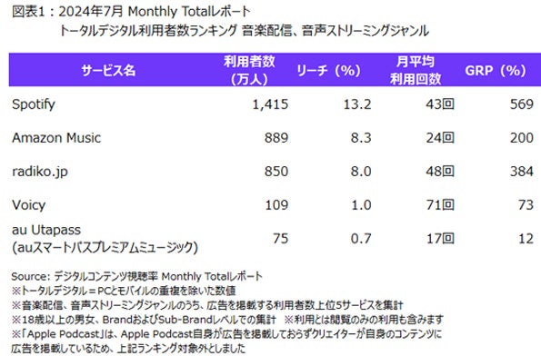 2024年7月のMonthly Totalレポートによると、音楽配信、音声ストリーミングジャンルのうち広告を掲載するサービスにおいて、利用者数が最も多かったのは「Spotify」で1,415万人、「Amazon Music」が889万人で続いていました。また、平均利用回数では「Voicy」が月71回で最も多く、「radiko.jp」が月48回で続いていました(図表1)。