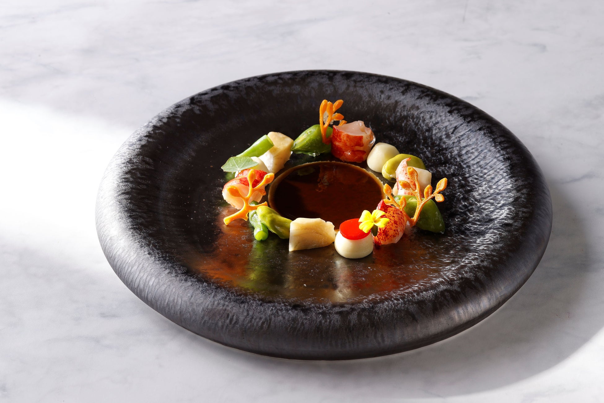 「カナダ産クリアウォーターオマール」は、ストレスの少ない独自のルートで届き、活きの良い状態のロブスターを、最も良い状態で処理することで、しっとりと甘味のある味わいに仕上がっています。独自のクール・ブイヨンで、オマール海老の個体に合わせてうま味を逃さず火を入れていきます。甲殻類の香りとうま味が凝縮した「ジュ・ド・ラ・プレス・オマール」の温かいソースをサーブします。オマール海老の殻を丁寧にソテーし、フォンドボーやミルポワ、スパイスと一緒に炊き上げ、手間暇かけたソースに仕上げるのは熟練の技。ジャック・ポリーの直伝のクラシカルなソースを、大塚のひと手間で滋味深い味わいに。