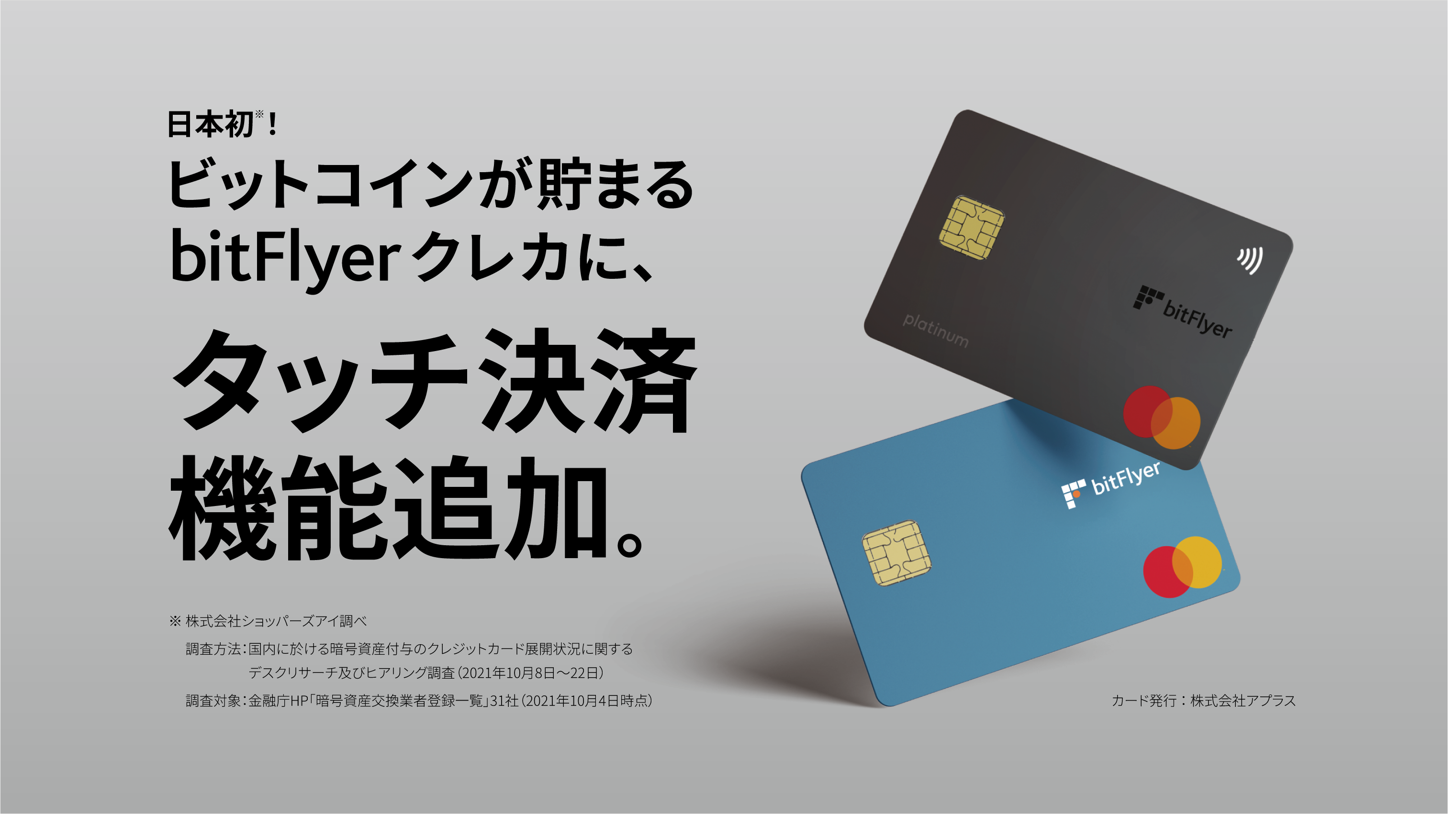 株式会社 bitFlyer(本社:東京都港区、代表取締役:加納 裕三、以下「当社」)は、当社が提供している「 bitFlyer クレカ」において、タッチ決済機能を新たに追加することをお知らせいたします。これにより、お客様はタッチ決済対応の端末に「 bitFlyer クレカ」をかざすだけで、簡単かつスムーズに決済いただけるようになります。また、「 bitFlyer Platinum Card 」の年会費及び年間利用額による優遇条件を改定することをお知らせいたします。