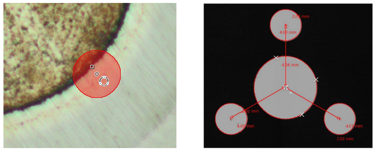 豊富な計測機能の一つとして、新開発した自動エッジ検出機能を搭載しています。従来は作業者が手作業でエッジ部分を選択していたため、作業者によって誤差が生じることがありました。本機能により、作業者による誤差をなくし、より的確にエッジを検出することで、対象物の形や中心の位置、直径、面積、他の対象物との距離を、誰でも簡単に高い再現性をもって測定することが可能です。