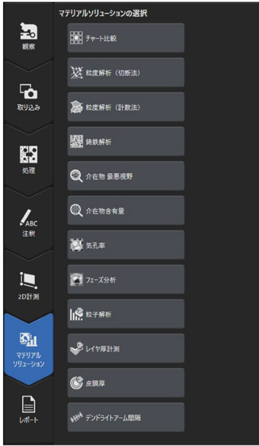 3. さまざまな分野に対応し、多様なニーズに応えるマテリアルソリューションさまざまな分野のお客様の要望に応えるため、業界標準に準拠した多種多様な解析・検査方法に対応が可能です。金属材料や合金の微細組織の解析で用いられる粒度解析、非金属介在物解析や、金属部品の切断や研磨などの加工で生じるキズや欠陥検出に用いられる粒子解析など、オプションで最大12種類のマテリアルソリューションを搭載し、幅広い解析に対応することが可能です。