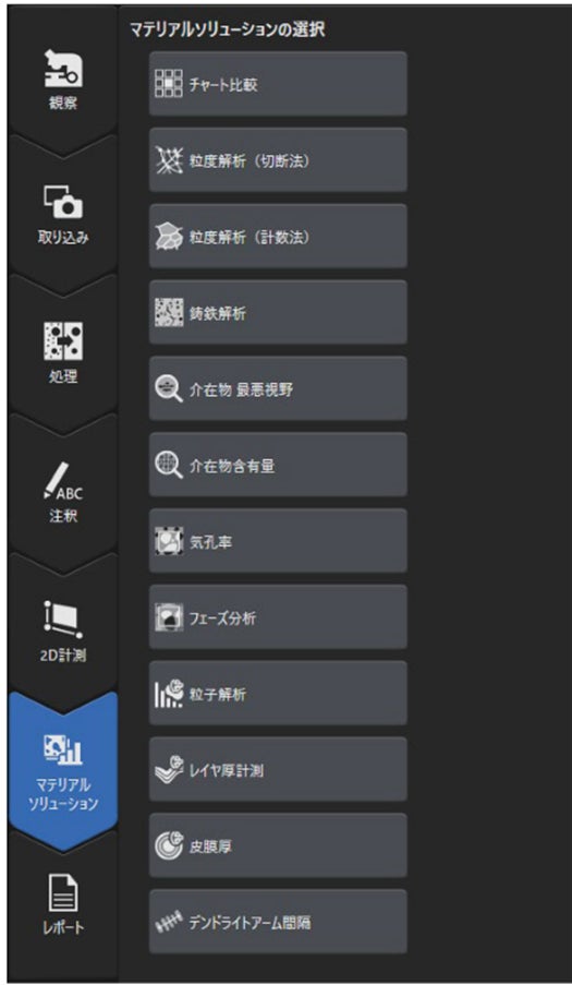 また本製品はあらゆる分野のお客様の要望に応えるため、金属材料や機械加工部品、電子部品などにおける研究開発や品質管理で実施される粒度解析や、非金属介在物解析など、オプションで最大12種類のマテリアルソリューションを用途に応じて選択でき、幅広い解析に対応します。