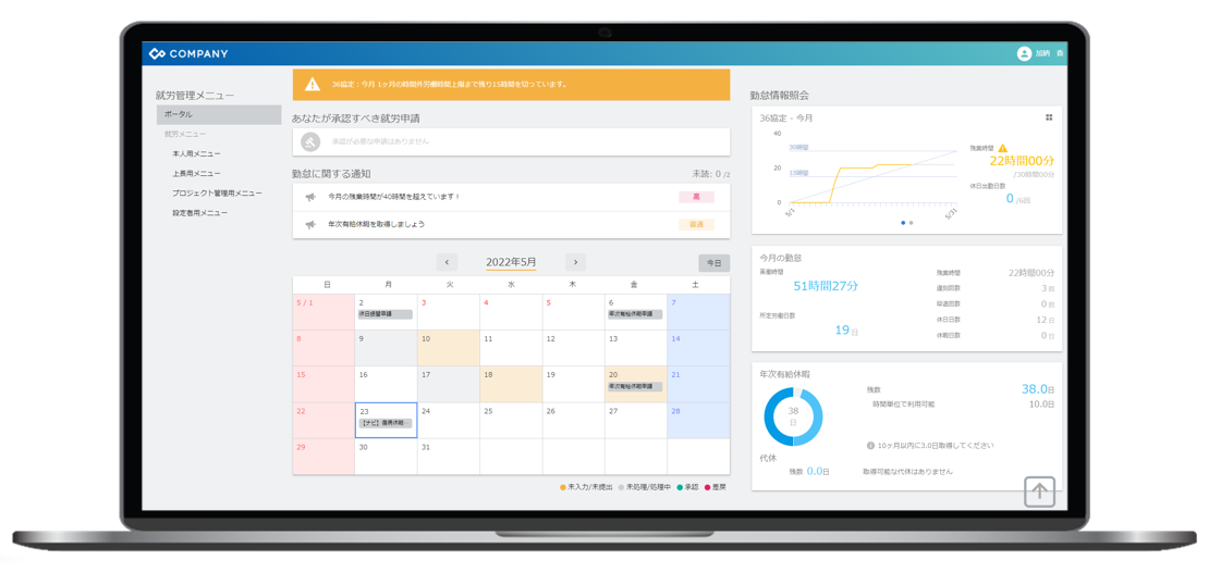 ▲勤怠ポータル機能で自身や部下の勤務実績、休暇日数等を一目で確認