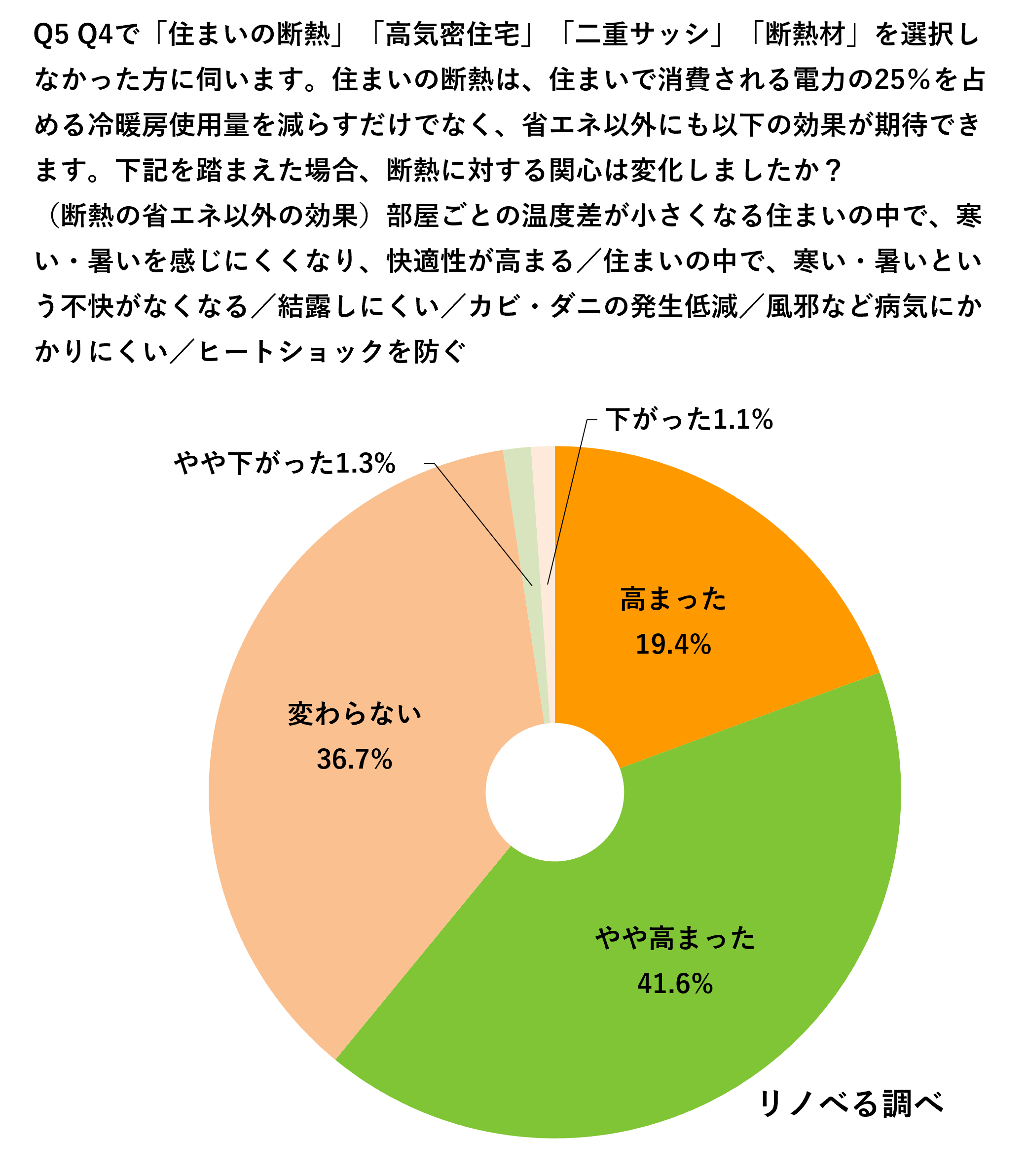 Q5:Q4で「住まいの断熱」「高気密住宅」「二重サッシ」「断熱材」を選択しなかった方に伺います。住まいの断熱は、住まいで消費される電力の25%を占める冷暖房使用量を減らすだけでなく、省エネ以外にも以下の効果が期待できます。下記を踏まえた場合、断熱に対する関心は変化しましたか?