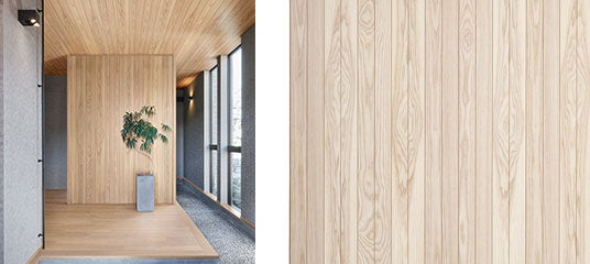 国産材突板を用いた住宅向け壁・天井仕上げ材です。約160mm幅のパネル中央に溝加工を施し小幅の羽目板状にデザインしました。洗練された印象となるよう可能な限り見切り材をスリム化するなど細部にこだわりました。壁から天井へ連続使用することで、木の温もりに包み込まれた安らぎの空間をつくり出します。リラックス効果を高めるため木目の表情がやさしく、穏やかな色味のタモ、ナラ、スギの3樹種で展開しています。