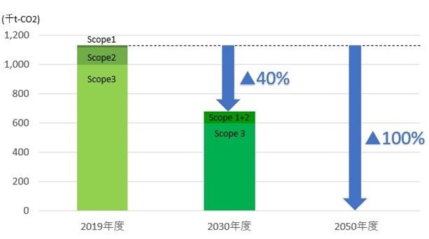 CO2 排出量を 2030 年度までに 40%削減(2019 年度比)、2050 年度までにネットゼロ