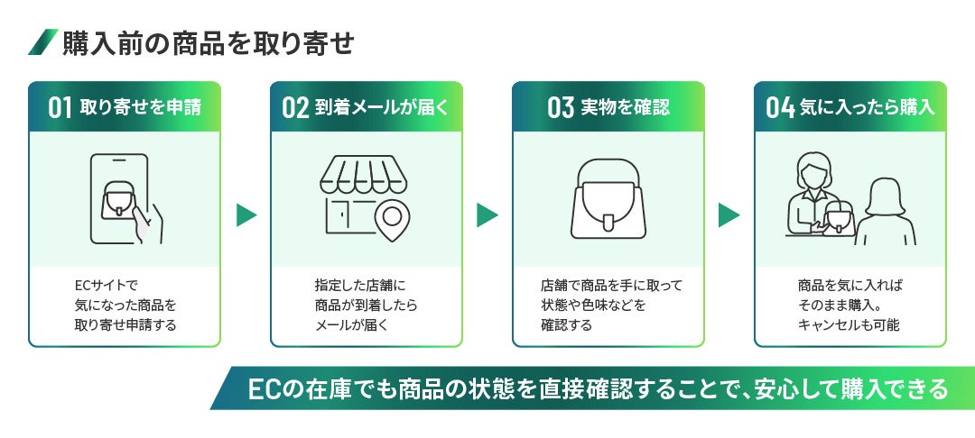 このような購入方法により、お客様は店舗の雰囲気を楽しみながら商品を確認してから購入することができ、より安心した顧客体験を得ることができます。また、事業者にとっては、返品・交換対応の削減や在庫管理の効率化が実現できるという利点もあります。
