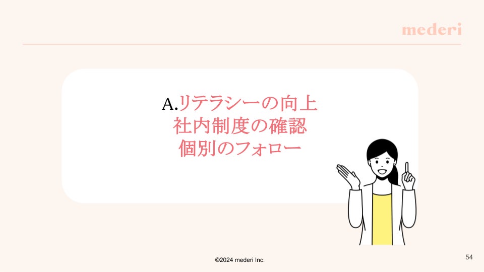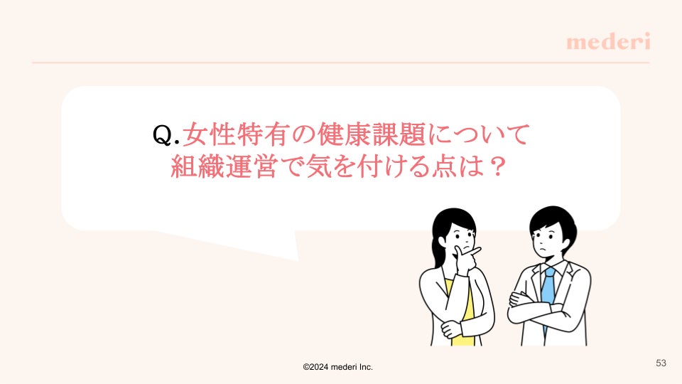 『女性特有の健康課題について組織運営で気を付ける点は?』という悩みについては、リテラシーの向上、社内制度の確認、個別のフォローが大切であることをお伝えしました。