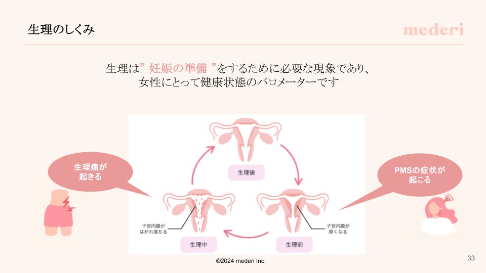 次に「知っておきたい女性の不調」のパートでは、現代の働く女性の約8割が生理トラブルによる仕事への影響を感じているというデータを紹介。さらに、生理中の女性の体内で何が起こっているのかを、イラストを用いて直感的に理解できる形でお伝えしました。