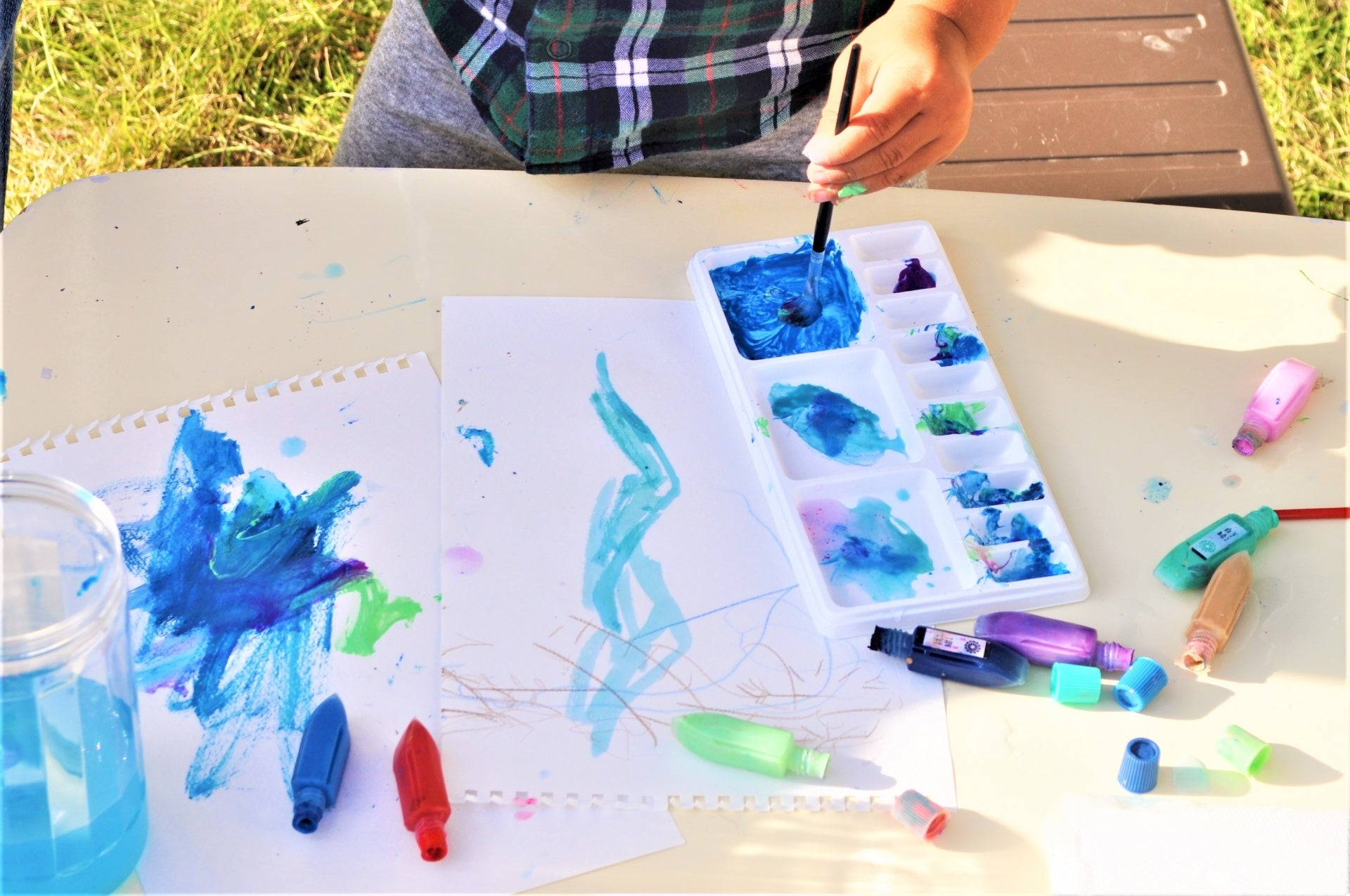 少し不思議な質感の絵の具で、ぽんぽんと自由に色を重ねていきます。