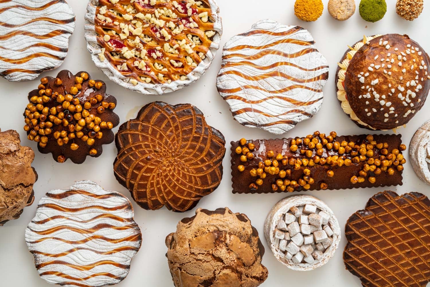 大地の恵みを彷彿させるナッツがぎっしりと詰まったキャラメルフィリングの表面の模様は拾い集めた木の実がたっぷり入った収穫かごをイメージしています。