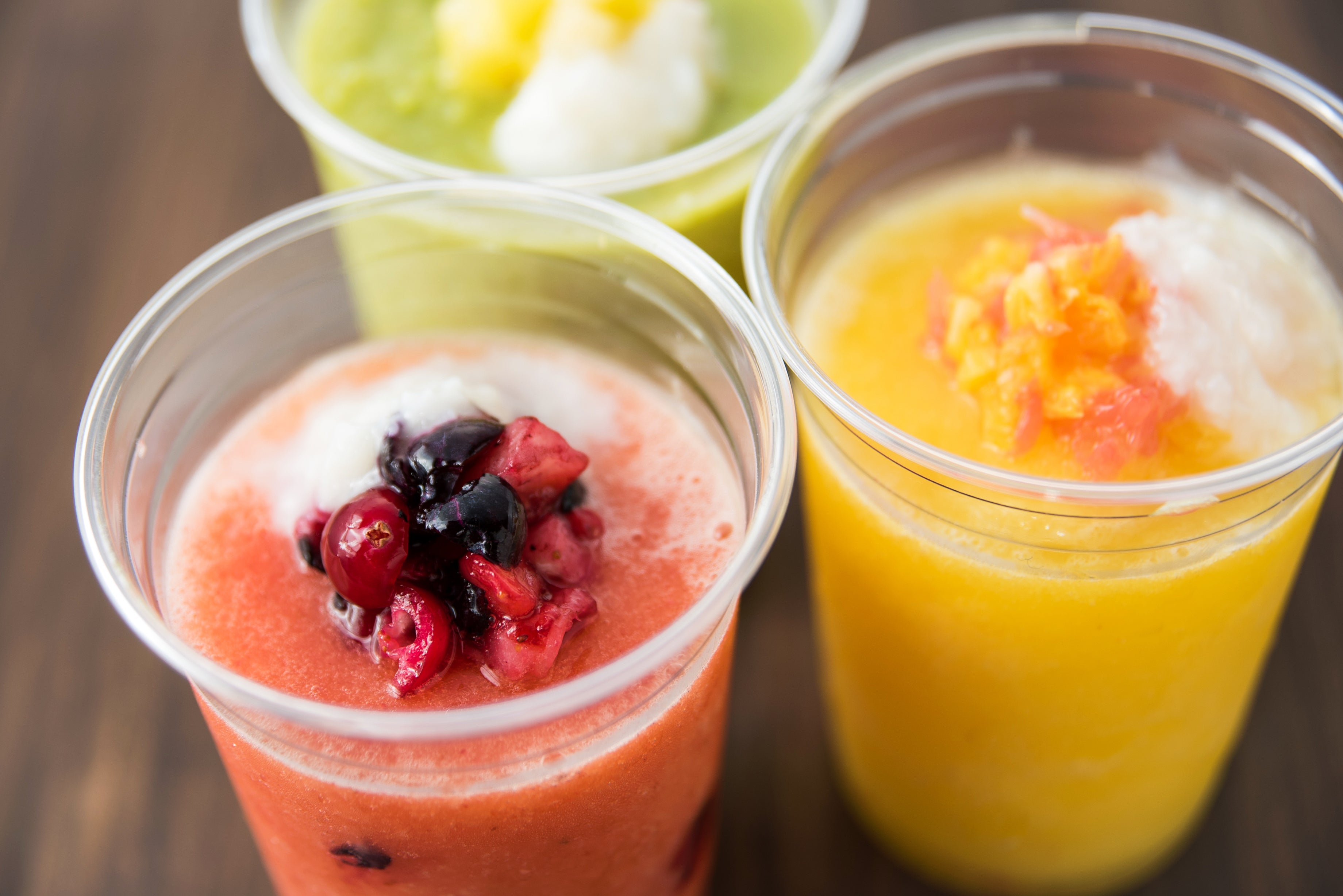 【商品の一例】 ¥680~ ■FRUITS SMOOTHIE W(ダブル)フルーツスムージー ベリー&パイナップル、バナナ&ストロベリーミルク、パイン&マンゴー他 ■VEGETABLE SMOOTHIE 34種の国産野菜と米こうじを使ったスムージー グリーン濃厚ストレート、グリーンヨーグルト、グリーンソイ他 ■HOT SOUP とろ~り濃厚かぼちゃのスープ、アスパラガスと玉葱のポタージュ、エビとトマトの濃厚スープ、とうもろこしの贅沢ポタージュ |