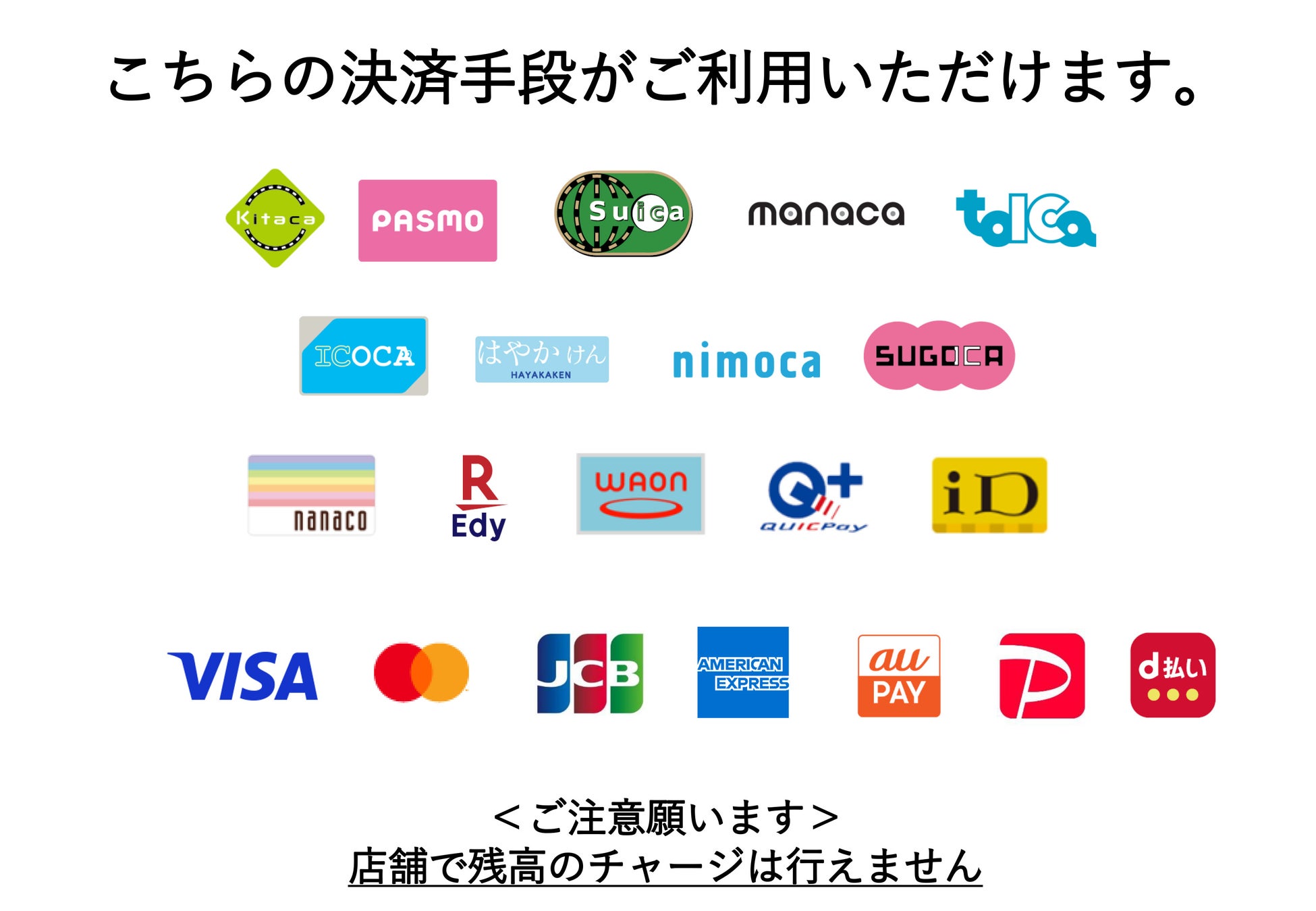 iD / QUICPay / nanaco / 楽天Edy / WAON / Kitaca / PASMO / Suica / manaca / TOICA / ICOCA / はやかけん / nimoca / SUGOCA