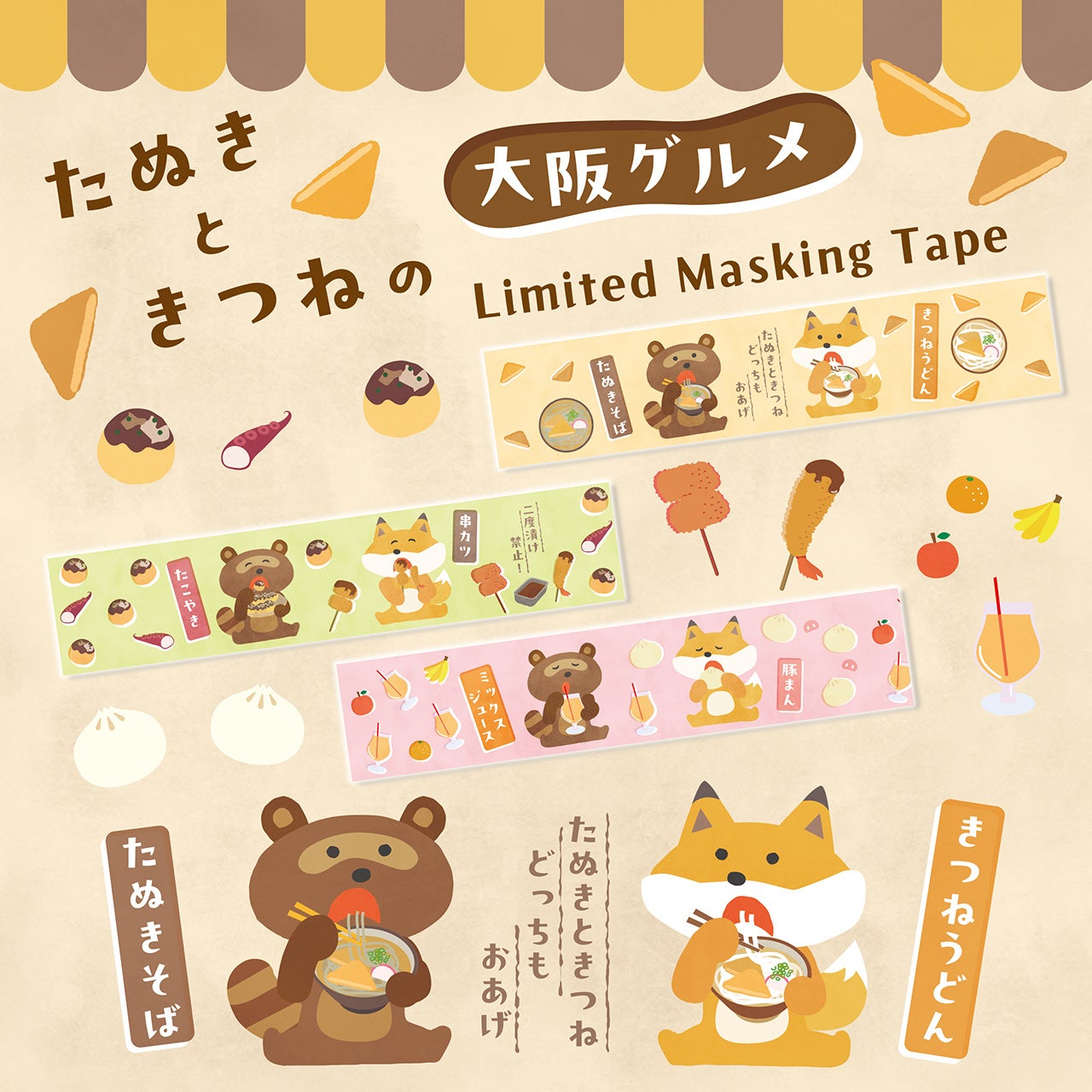たぬきときつねが大阪の名物グルメを紹介してくれるイベント限定マスキングテープです!そばやうどん、たこ焼きに串カツ、ミックスジュースに豚まんなどお腹がすきそうな名物グルメをご用意しました♪おみやげとしてお一ついかがですか?