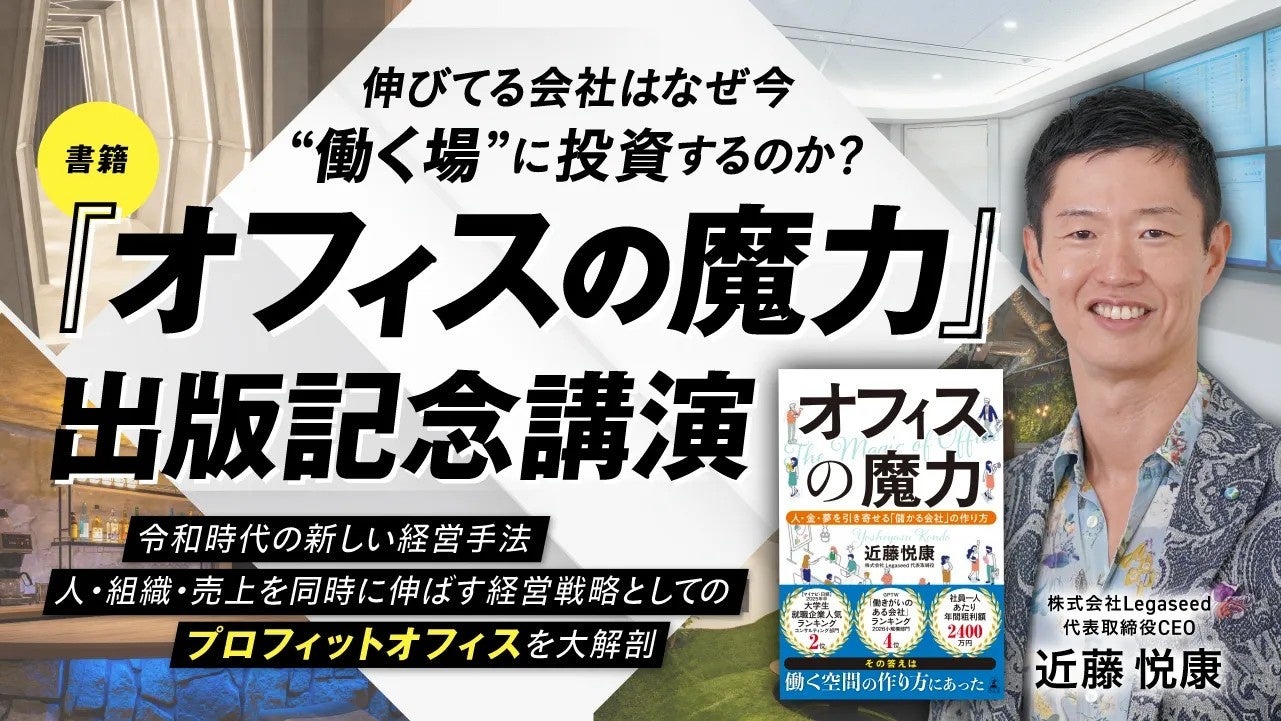 『オフィスの魔力』の発売を記念し、著者・近藤悦康による出版記念講演を開催いたします。書籍の内容をさらに深掘りし、Legaseedのオフィスを実際にご覧いただきながら、「儲かるオフィス」の設計思想を体感できる特別な機会です。