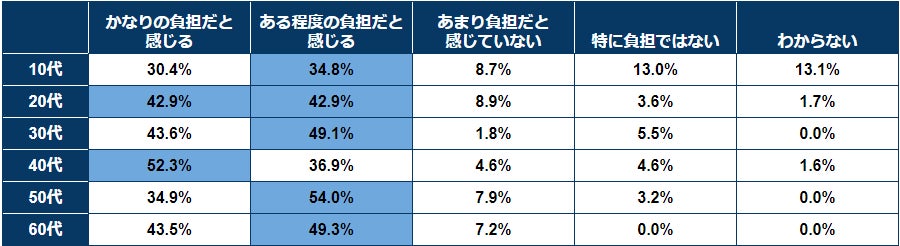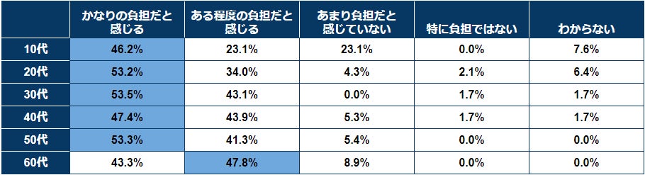 また、「現在の電気料金の値上がりは、あなたの家計にどの程度負担だと感じますか?」と質問したところ、年代別の男女で以下のような回答結果になりました。