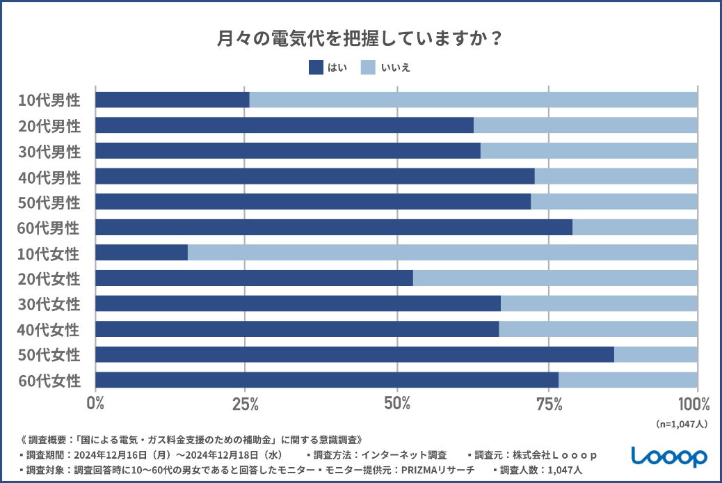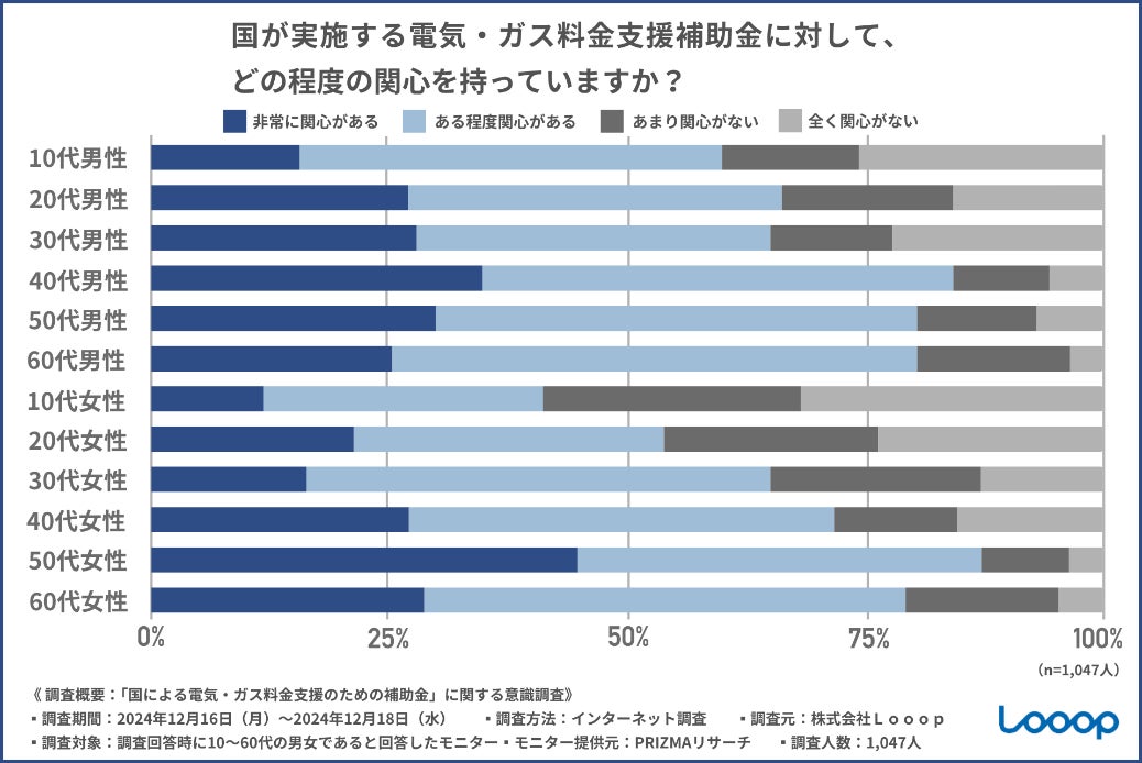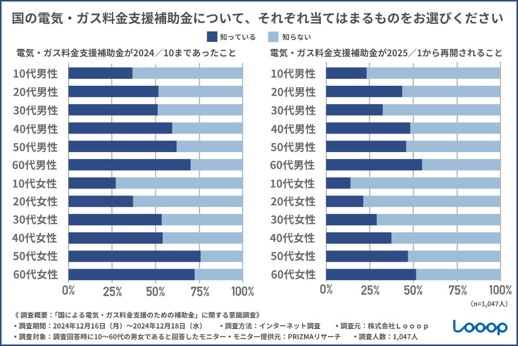 「エネルギーフリー社会の実現」をビジョンに掲げ、再生可能エネルギーのニーズ喚起と普及を目指す株式会社Looop(本社所在地:東京都台東区、代表取締役社長:森田 卓巳)は、政府による電気・ガス料金の補助(参考URL:https://www.meti.go.jp/press/2024/12/20241220003/20241220003.html)が2025年1月から再開することを踏まえ、2024年12月、10~60代の男女を対象に、「国による電気・ガス料金支援のための補助金」に関する調査を行いました。