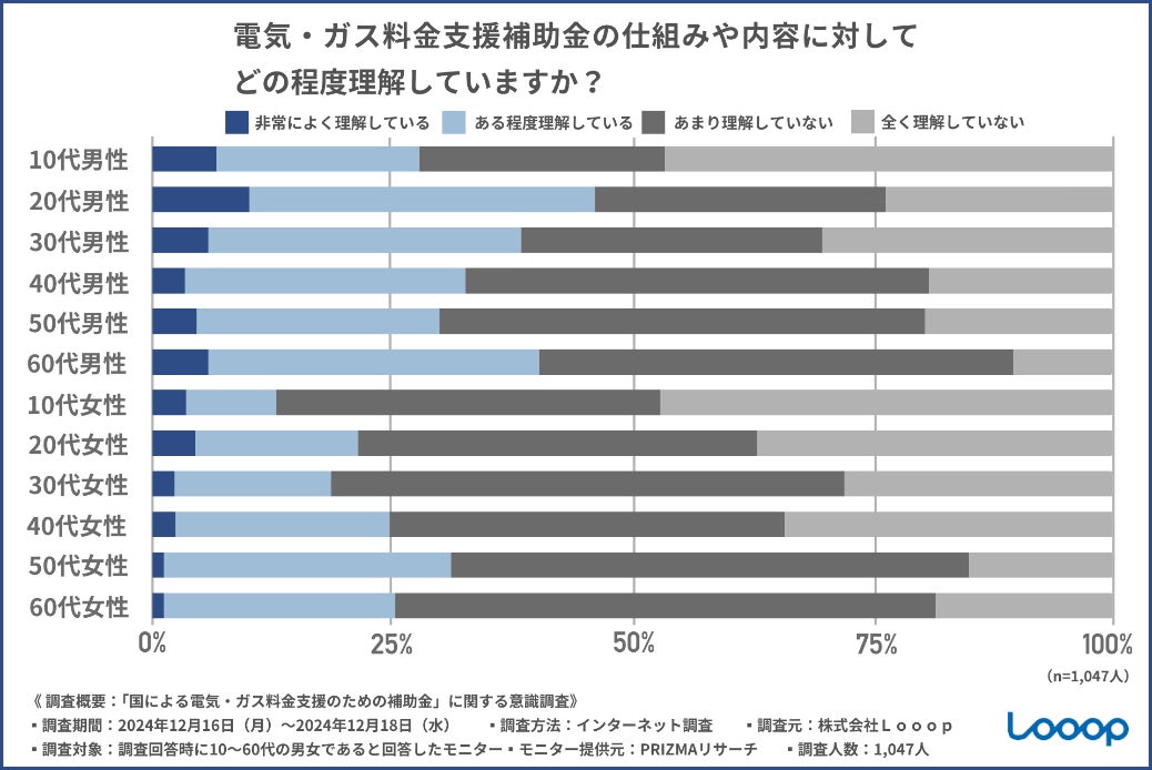 今回の調査では、国による電気・ガス料金支援補助金について、10~60代の男女の認知度や理解度に大きな差があることが明らかになりました。