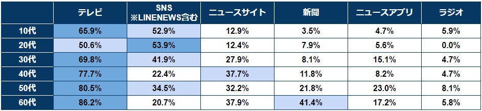 10~30代はテレビに次いでSNSが多いですが、40~60代はニュースサイトや新聞と回答した方が多い傾向が見られ、情報収集のあり方の世代間の差が見られました。