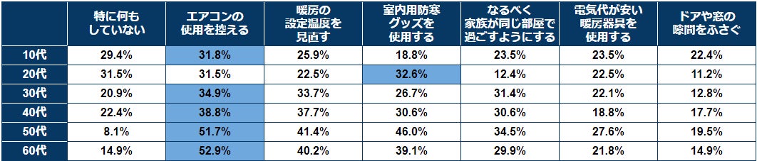どの年代の男女も『エアコンの使用を控える』と回答した方の割合が多く、特に50~60代では約半数が選択していることから、エアコンの電気代を気にしていることがうかがえます。