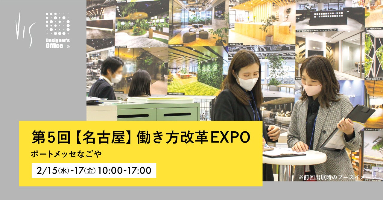 デザイナーズオフィスを手がけ、「はたらく」をデザインする株式会社ヴィス(本社:大阪市北区、代表取締役社長:金谷智浩)は、2023年2月15日(水)-17日(金)に ポートメッセなごや(愛知県名古屋市)にて開催される「総務・人事・経理Week内 第5回【名古屋】働き方改革 EXPO」に、名古屋では初出展します。来場者の働き方やオフィスに関する相談に対応します。