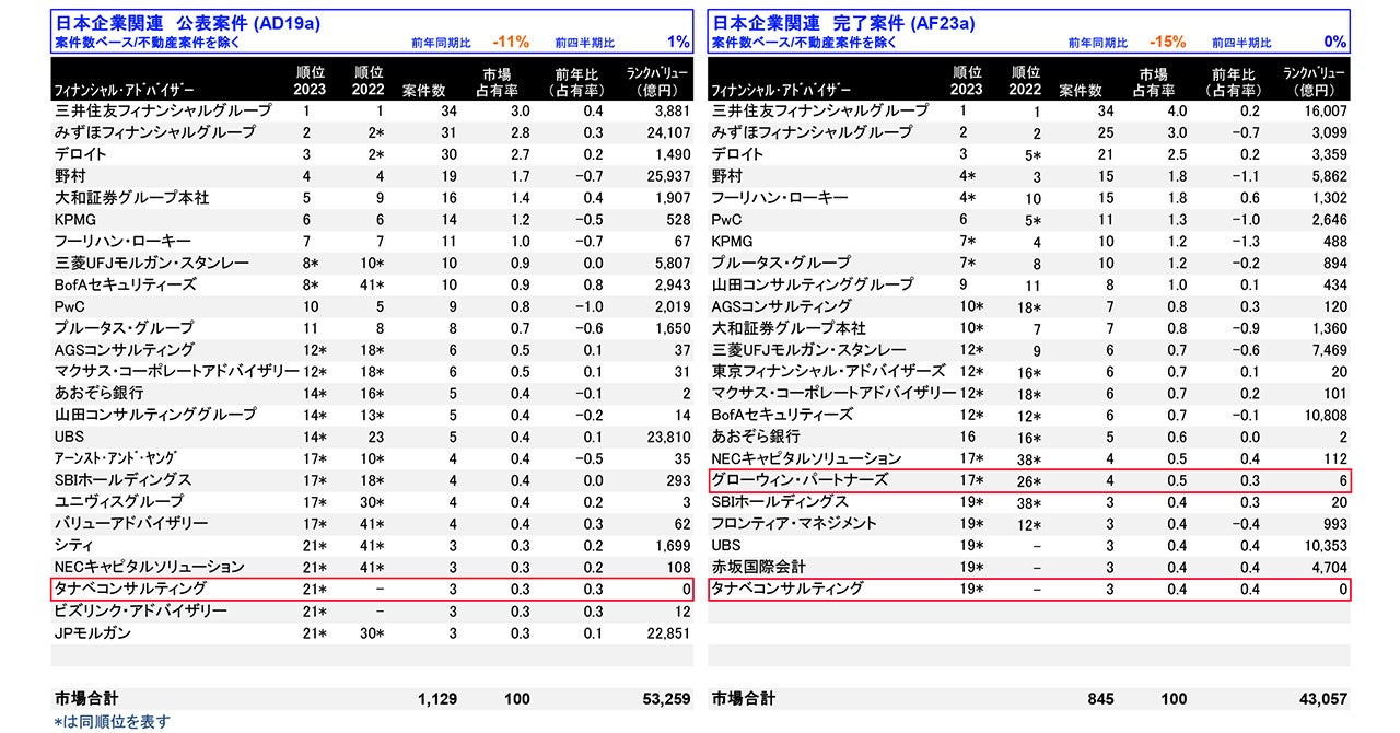 タナベコンサルティング、グローウィン・パートナーズ、リフィニティブが発表する「日本M&Aレビュー2023年 第1四半期」にランクイン